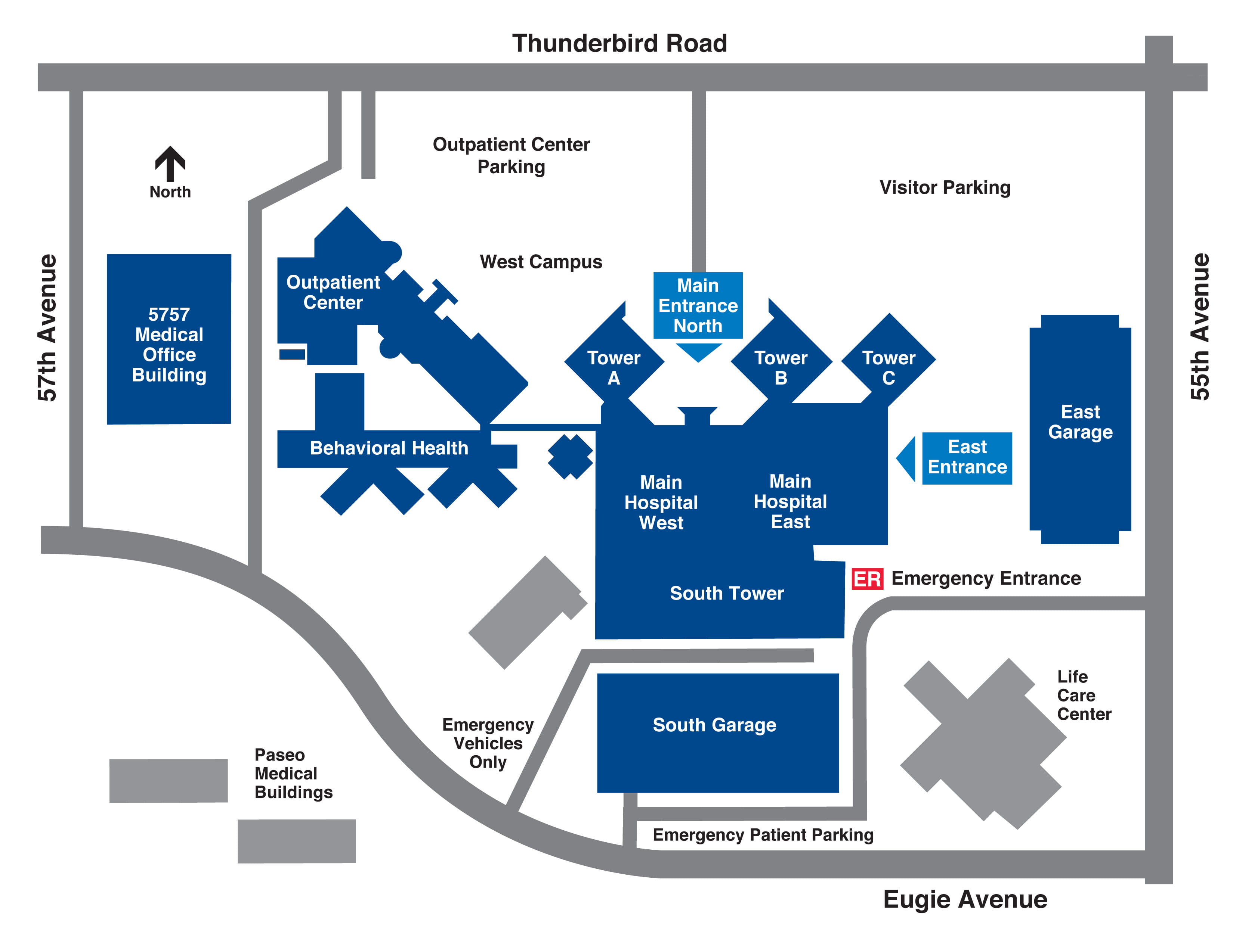 Se requiere información del vehículo como marca/modelo, color, año, estado y número de placa para obtener su pase de estacionamiento. El estacionamiento reservado en los garajes en los lados este y sur del campus está disponible para los médicos. La puerta requiere deslizar una credencial para acceder. Hay otro estacionamiento cubierto disponible en los lotes de superficie de Thunderbird Road y cerca de la entrada al departamento de emergencias en el lado este del campus. Varios lugares están reservados para los médicos obstetras.
